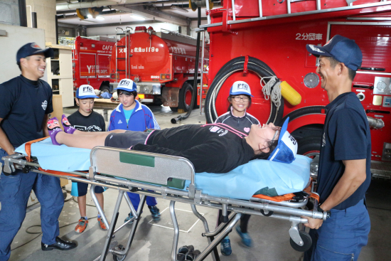 旭ヶ丘の登山訓練は前日の雨の影響で残念ながら実施できませんでしたが、消防庁舎にて救急車の見学や三角巾を使い応急処置を学びました。その後はクラブ員で協力しテントを設営し火気取扱訓練を兼ねたバーベキューを行いました。