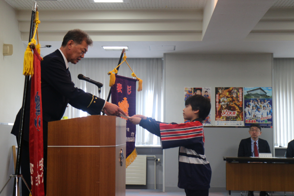 消防署長からクラブ員へ任命書が交付され、クラブ員は希望に満ちあふれた表情で受け取っていました。