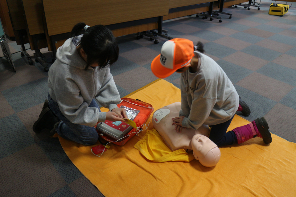 初めに救命講習についての講義を受け、その後実際に訓練用人形を使って心肺蘇生法、AEDの取り扱い訓練を行いました。