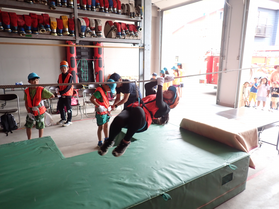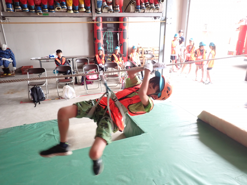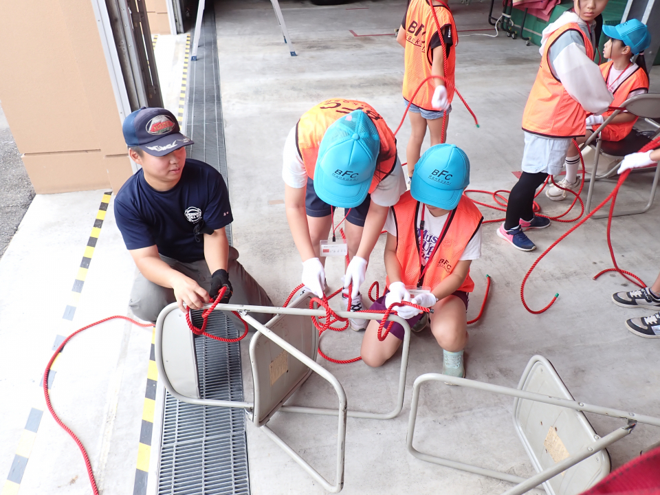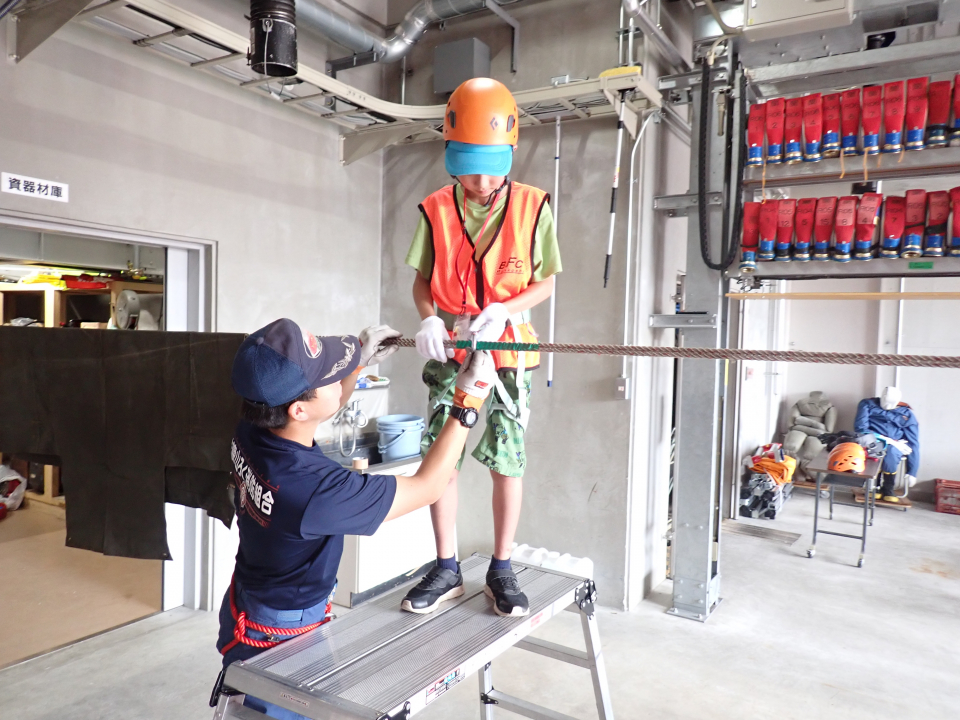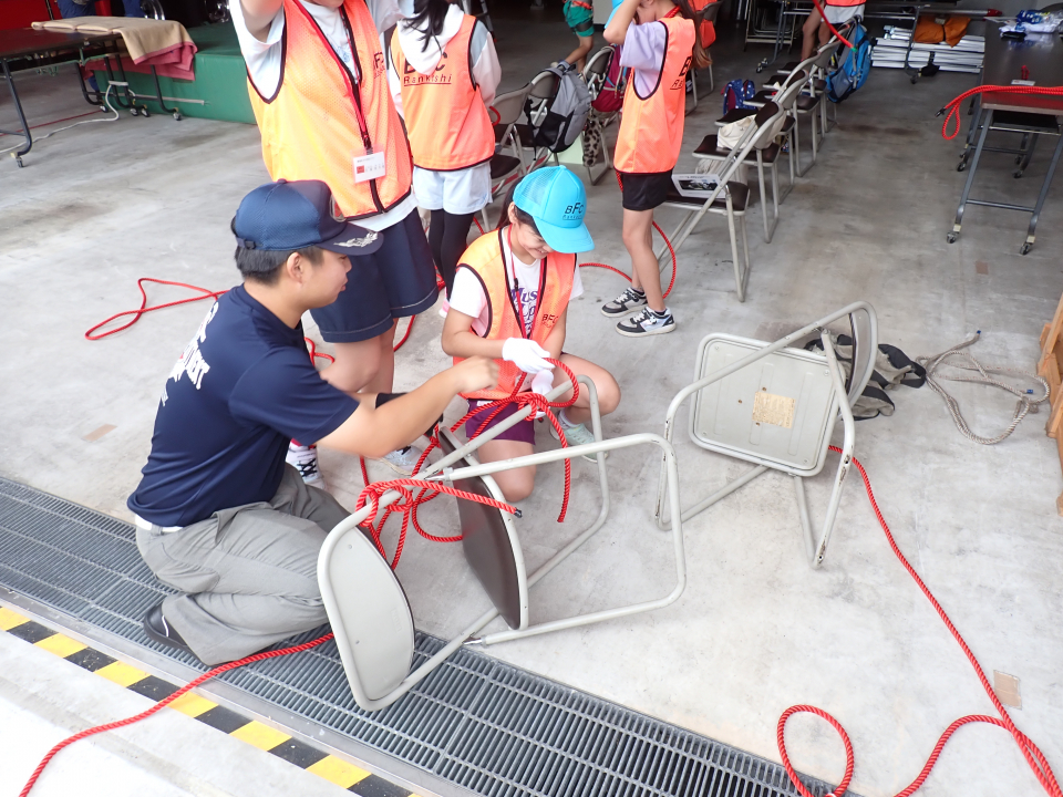 ロープ結索訓練では、ロープの結び方をすぐに覚えて、色々な物にロープを結べるようになりました。ロープ渡過訓練では、初めての体験で戸惑いながらもコツを掴みスムーズにロープを渡っていました。