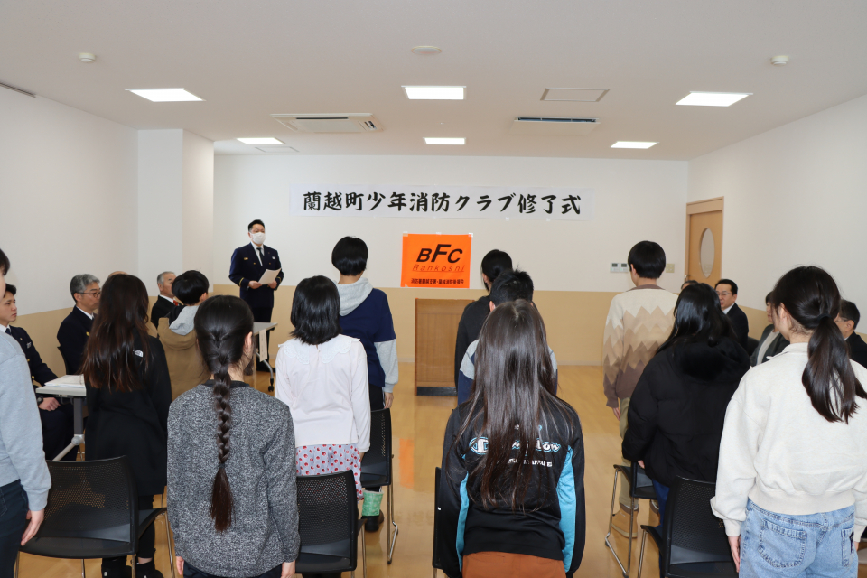 令和8年2月7日(土)に第3期蘭越町少年消防クラブ修了式を挙行しました。クラブ員18名のうち12名が出席し修了証書が手渡され、消防署蘭越支署、蘭越消防後援会から記念品が贈呈されました。