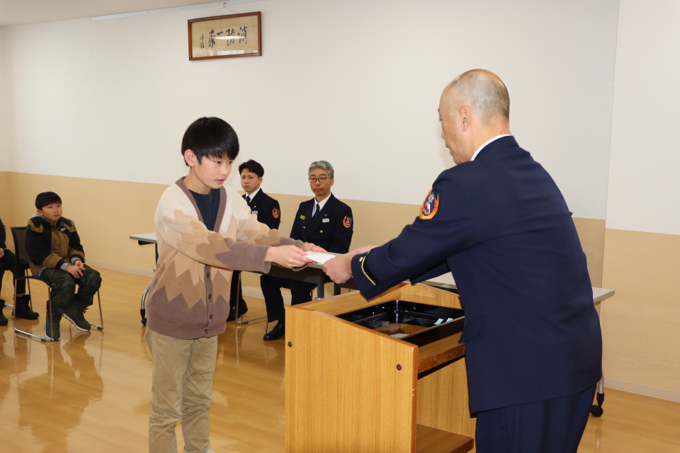 クラブ員を代表して会長の河西詠人さんが「クラブ活動を通して教えていただいたことをもとに、学校の友達や家族、危険なことをしている人を見たら注意するなど火災予防の普及に努めます。」と答辞を述べました。