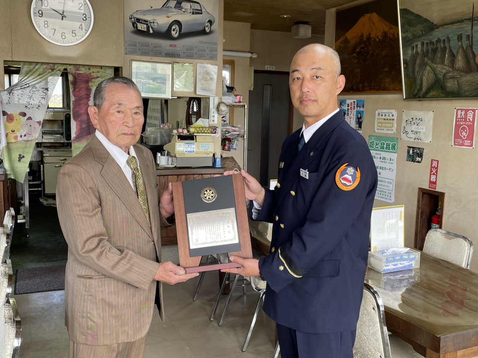 令和5年5月25日羊蹄山ろく消防組合消防署蘭越支署長大津直輝から三上氏へ表彰状が伝達されました。