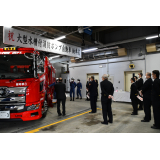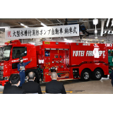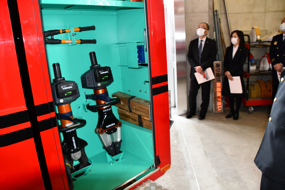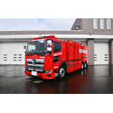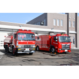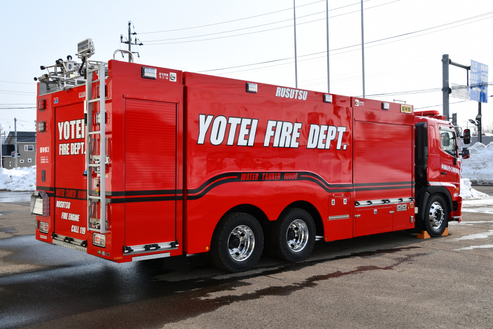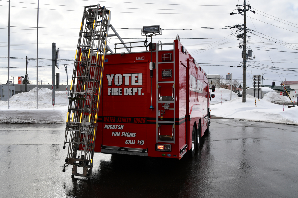今回新しく導入された大型水槽付消防ポンプ自動車の主な装備は、ポリプロピレン樹脂製水槽(10000L)、PTO駆動式A-2級アルミ製2段バランスタービンポンプ、リモコン式車両上部照明装置、大型電動油圧救助器具(スプレッダー・カッター)、電動式梯子昇降装置 等を搭載しております。